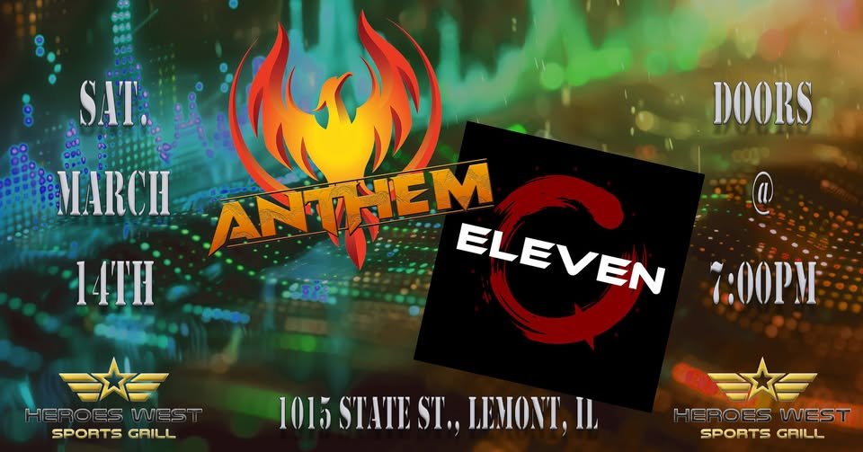 Anthem @ Heroes West Lemont+ Add to Google Calendar+ iCal / Outlook export 00days 00hours 00minutes 00seconds DateMar 14 2026 Time 7:00 pm - 11:00 pm LocationHeroes West1015 State Street, Lemont, IL. 60439Share this event